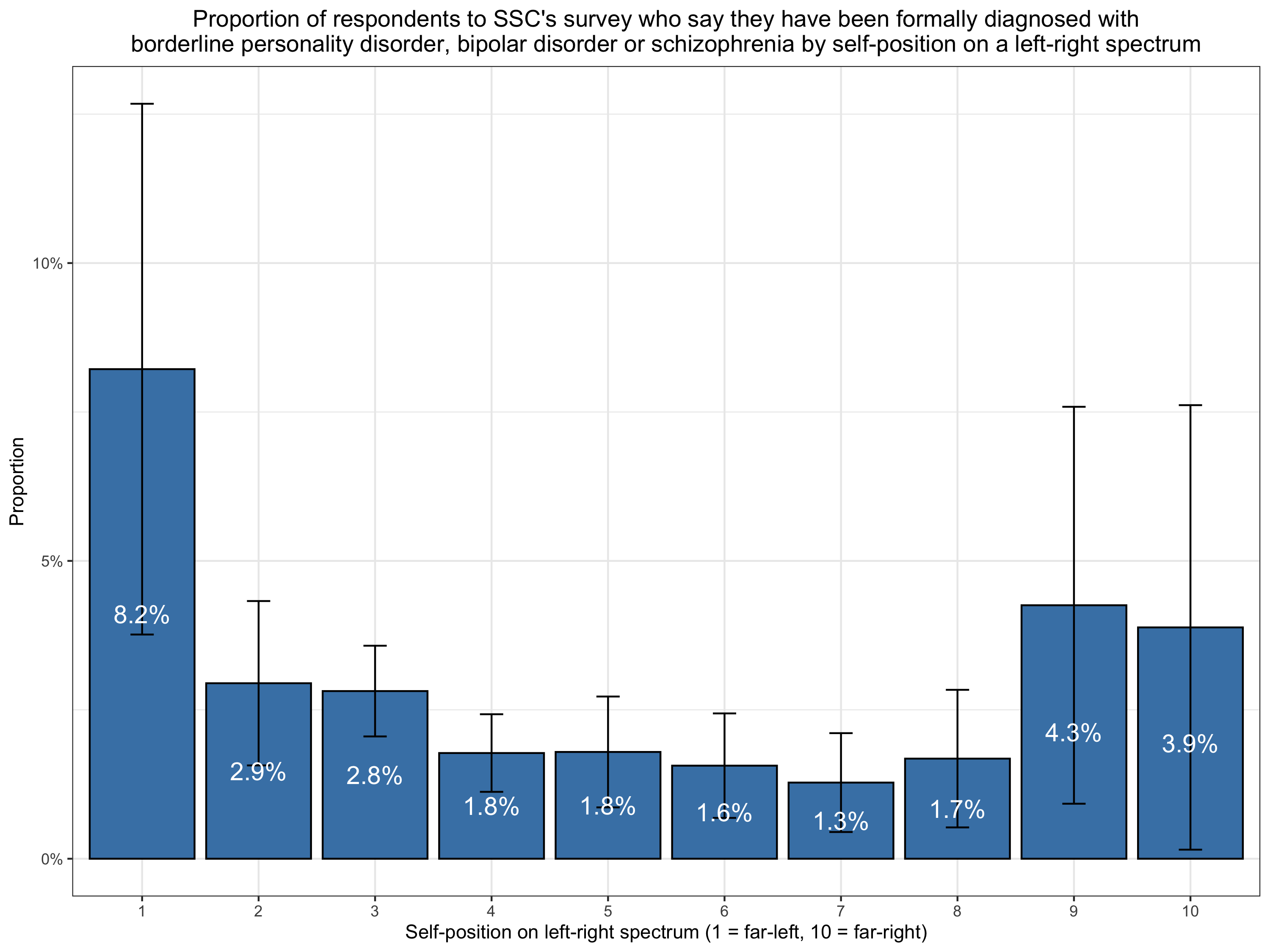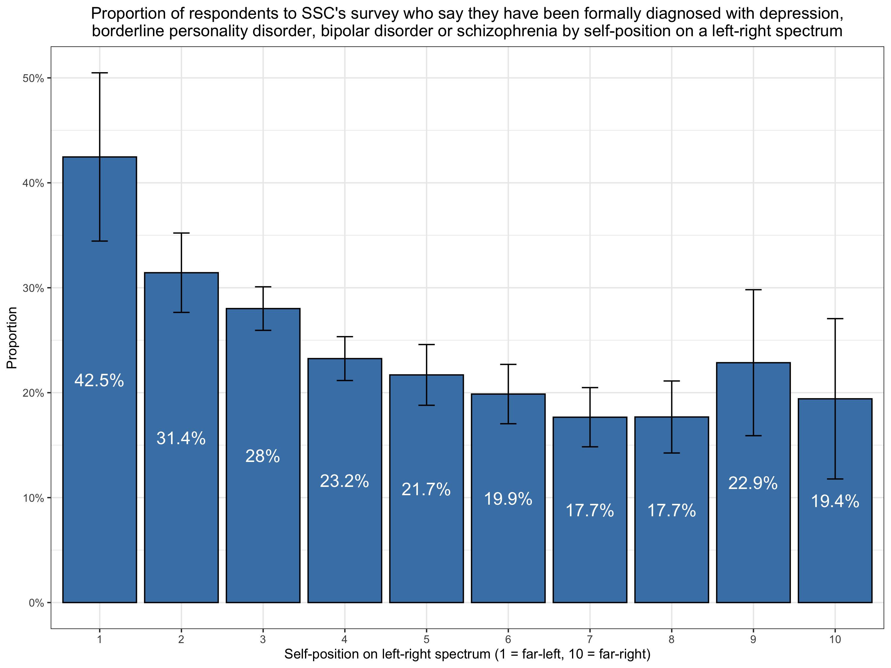 4. The SSC survey is a bad sample to use for this [links between political views and mental illness], not just because it’s unrepresentative, but because it might be unrepresentative of different political affiliations in different ways. For example, SSC Marxists really are surprisingly depressed, but maybe the only Marxists who would read an anti-Marxist blog are depressed Marxists looking for things to be miserable and angry about (though see below for some counterevidence).