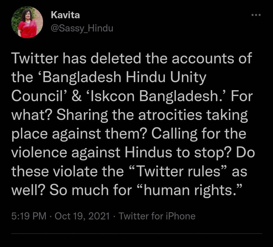 This was during one of the regular islamist reigns of terror in Bangladesh (triggered by an alleged insult to the Prophet), where Hindus and other non-Muslims were under attack. Twitter deleted the accounts who were reporting on the atrocities. Meanwhile, they would take their sweet time in banning ISIL-connected accounts