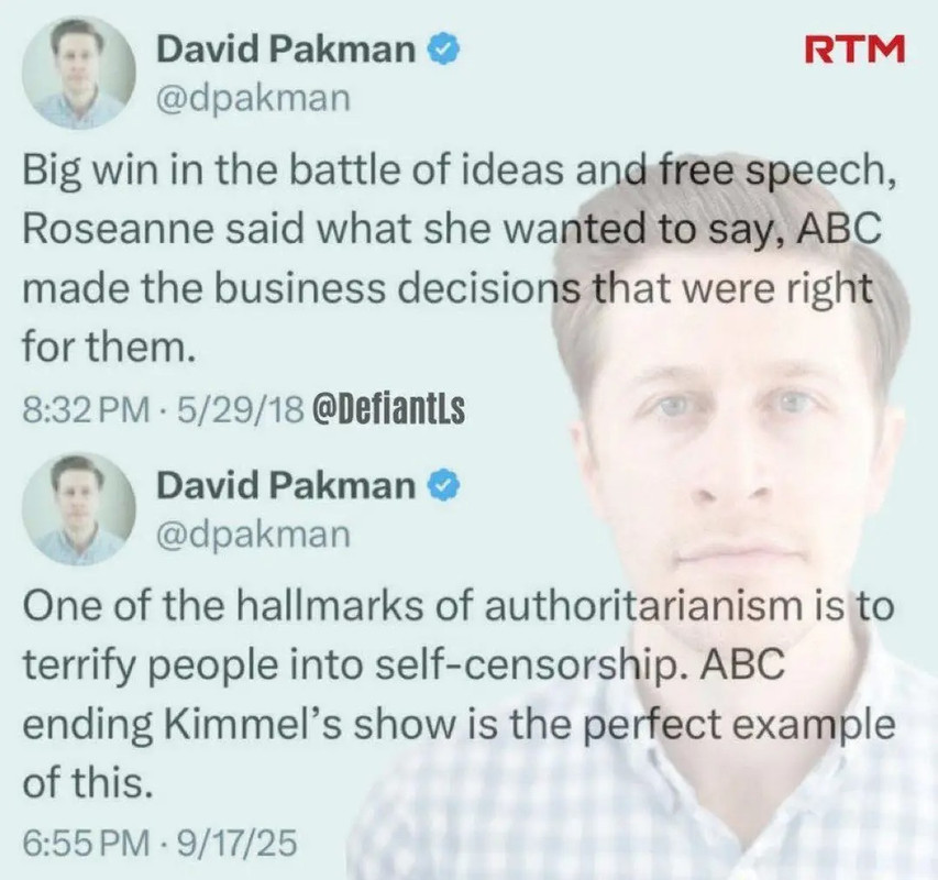 On the other hand, Kimmel was making fun of the president and his followers, not of Kirk, while very clearly condemning the murder. The FCC made direct threats to make life uncomfortable for his company if he wasn't fired and the US president himself has demanded not only his firing, but also other people with critical/unflattering takes of him, such as Seth Myers and Jimmy Fallon.