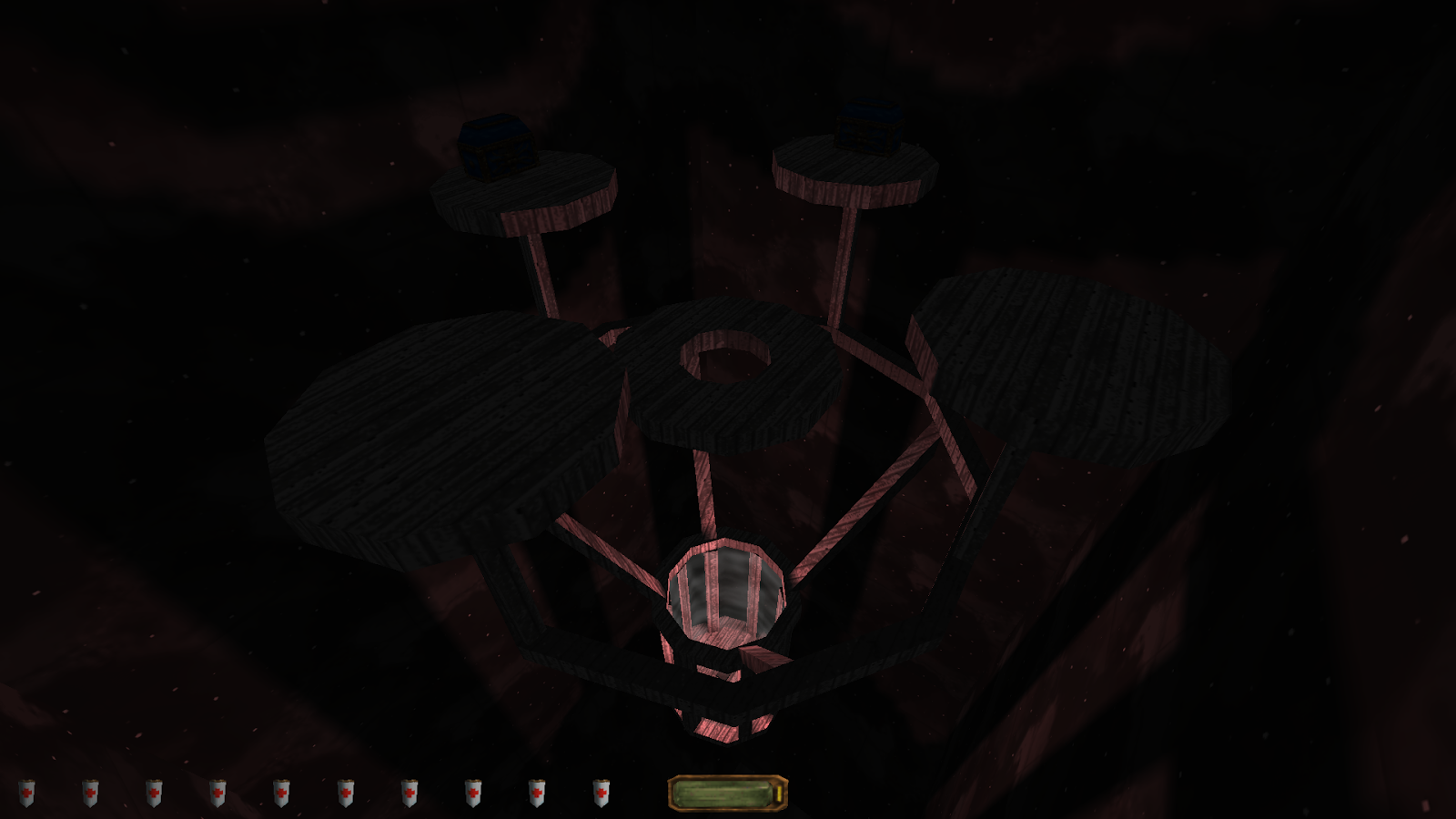 There is a bizarre area that may have been going for a Sword vibe and also leads to some more clanging around. It's an outdoor scene with a pit and some ledges. On the ledges are some frog-beasts that never attack me. To reach the ledges you ride glass platforms you activate with levers. It sounds like a tap-dance party whenever I jump on these platforms. Even worse is when I reach the end part of this little side area: a large room with concentric, ring-like platforms. I hit each of these ring-platforms hard. For someone who is usually a dedicated ghoster, this segment always feels uncomfortable.