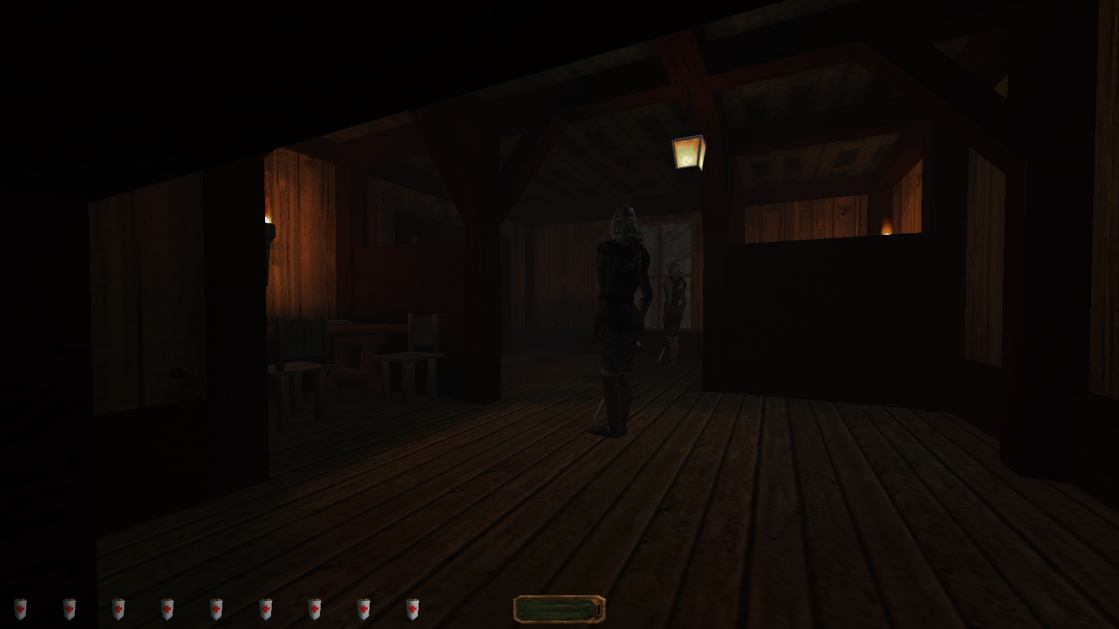 Gathering at the Inn you play as Dante, one of the thief characters from the greater “Circle of Stone and Shadow” fiction. He is on a trial run for Lord Nightfall, the warden he's recently signed with, and the objective is to steal a bunch of scepters from members of a scepter owner's club who are each staying at the “Grieving Burrick” inn. The main goal is a fire mage's scepter but to disguise the theft of this one item all the scepters, six in total, are to be stolen. Dante must also pick up some loot and, on the highest difficulty, avoid harming anyone but the guards. (Using a blackjack is harmful.)