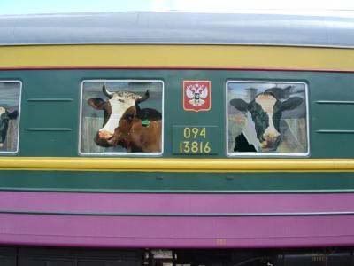 Perhaps it is somehow connetecd to: cow = slow, train = fast. To glimps a cow from a train is not that big of an achievement, right? ;)