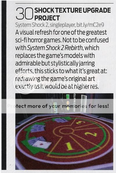 I'm sure that some here have seen this and it's not worth rushing out to buy it just for this, but the Shock Texture Upgrade Project got a mention among the "50 essential mods" article in the latest (Nov 2009) issue of PC Gamer. The mods mentioned are in no particular order, in fact they're divided into mod types so they're not trying to rank them.