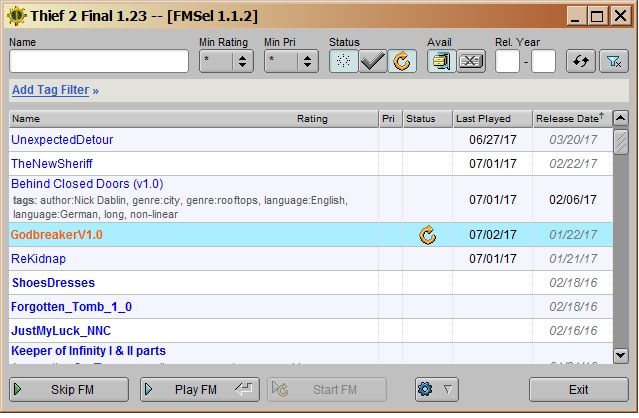4. Restart Thief 2 NewDark. FMSel should show the installation dialog again ("where are your missions?" etc.). After finishing that dialog, FMSel will go through the available missions and create entries for them in the table displaying FMs to play. Once FMSel has done that, you should have a working FMSel installation again. You will just "lose" the icons showing you which FM you already completed and which one you were currently playing.