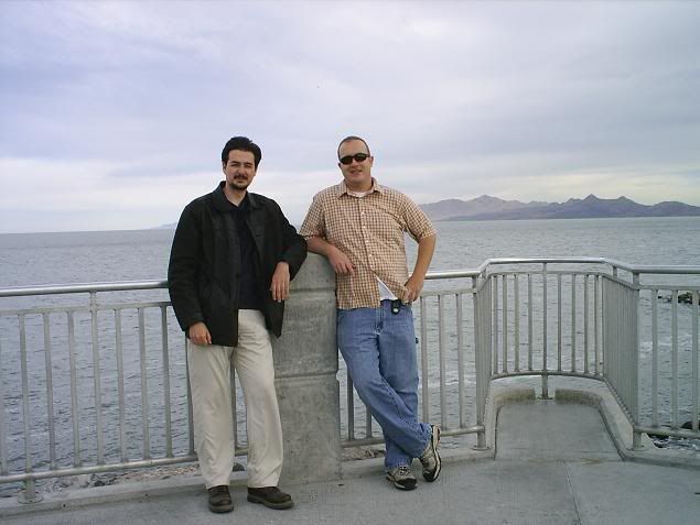 Can I say what a pleasure it was to have Raph visit in SLC? Okay, I already said it, but yes, we had a fun time. We had dinner at David's Kitchen, a famous Chinese restaurant here in SLC. Then we had wine and conversation back at my place. We all watched a little CSI season premiere, so that was fun. This morning, we visited the Great Salt Lake and downtown SLC. Then Raph left for his wonderful trip through Wyoming. Here's Raph and myself at the Great Salt Lake.