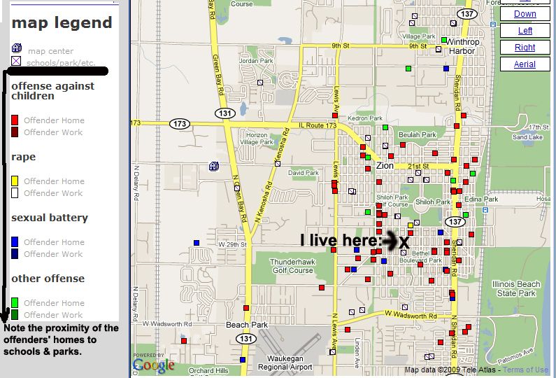 What scares me is the sheer number of sex offenders/child molesters; especially in my neighborhood alone! Though it's against the law for these offenders to live within so many feet of a school or any other place where there are children such as a daycare center, you can see from the map that the offenders' residences are far too close to these places for comfort. (I doubt that