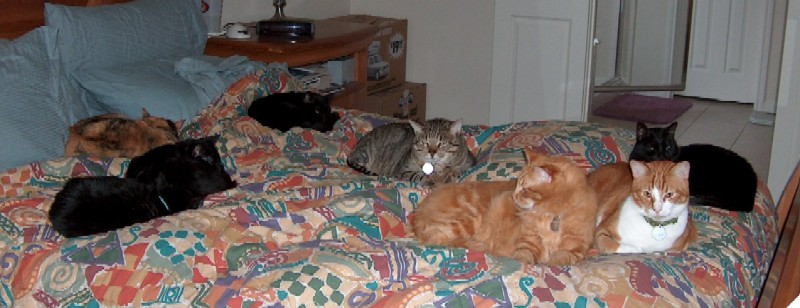 Here are my 8 cats enjoying the heating blanket on a winter day.