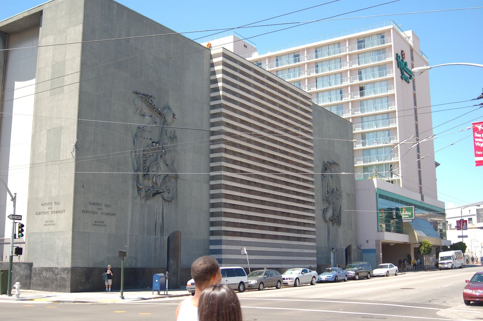 http://s48.photobucket.com/albums/f213/Fafhrd42/TTLG%20CA%20USA%202007/th_DSC_0045.jpgThe Pacific Gas and Electric Company Mission Street Substation. Has these really cool art deco frieze things going on, and they're COVERED IN PIGEONS, <strike>unfortunately the photobucket resize doesn't do them justice.</strike> Now presented in full size glory!