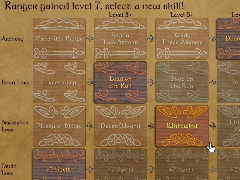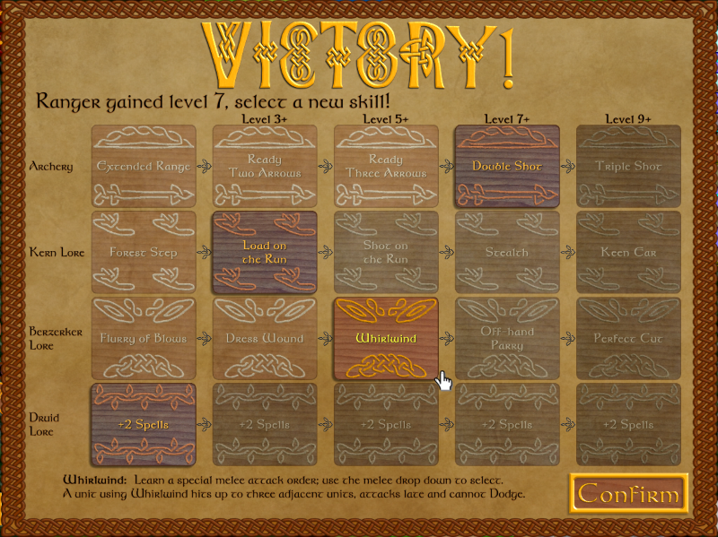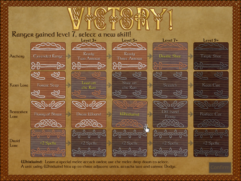 Still banging away at this. Now I've got all the unselectable skills (ones you either already have or cannot yet get) blended into the parchment, while the selectables sit above it. Pops the important ones out a lot better, I think. I also unified the gold treatment of the confirm button and big ol' VICTORY thang. The "VICTORY" header exists across multiple pages so I'm not too fussed about it not fitting into the parchment specifically, so long as it fits into the game in general (and if it doesn't I have a problem, because virtually ALL my buttons are using the same color and style).