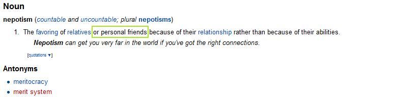 Nepotism actually entails any favoritism directed toward anyone because of either a familial connection or simply a strong personal relationship.