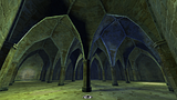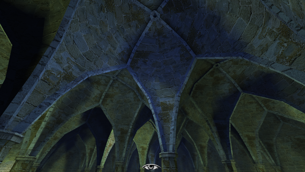 I cheated. The part the player can reach is modeled in DromEd. The groin arches themselves are objects that fit together like jigsaw puzzle pieces. I decided not to worry about someone shooting an arrow at a stone groin arch and getting upset that it breaks seemingly in mid-air or imperfect shadowing way up there. Tough tookies to that person. Besides my main purpose was for a set to shoot a briefing movie and the arches may never see the light of day in an actual mission.