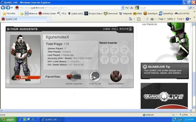 http://i5.photobucket.com/albums/y183/Fig455/gunsmoke.jpg My current profile. Yeah, not the greatest, but I haven't played since '03. Anyway, I am getting back into my groove, and looking for TTLG'ers. Friend my profile xgunsmokex @ quakelive.