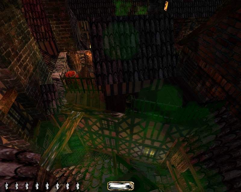 Twas not too hard. You need a few crates. (easy enough to find). Rope up and leap onto the metal thing just below the balcony below the chimney. (you can just see the rope in the lower right of the posted screen.) Toss two crates onto the blocked off balcony area. Use another crate on the metal platform to stand upon. With a combination of mantle and lean forward you can squirm your way between the railings where the two objects meet. From there it's a matter of getting on top of two crates and then mantle upon the chimney. (you can just see the edge of a crate to the right of the light gem) A leap from the chimney towards the TNT barrell yeilded no damage to Garrett.