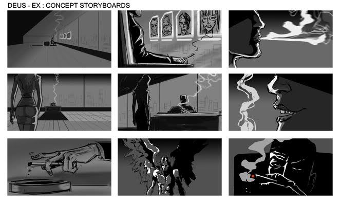 http://i76.photobucket.com/albums/j35/XAcerbusX/DEUSEXBOARD1.jpgNotice how there's virtually no decoration in the office whatsoever? That's because it's the roughest of sketches. That's what storyboards are. What matters are the sharp shadows, the lighting, where characters are standing, and how the shot is framed. Does this look ANYTHING like what the cutscenes in Deus Ex: Human Revolution ultimately became? Of course not.