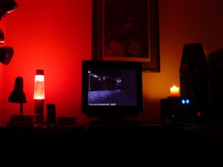 Pics came out way to bright, though. That there is just enough light to make out the keys on the keyboard. I've found red lights work better for back lighting. Maybe it offsets LGS's fondness for blue. I ought to be able to explain this color theory in my sleep -- but it's the lack of decent sleep that's getting to me.